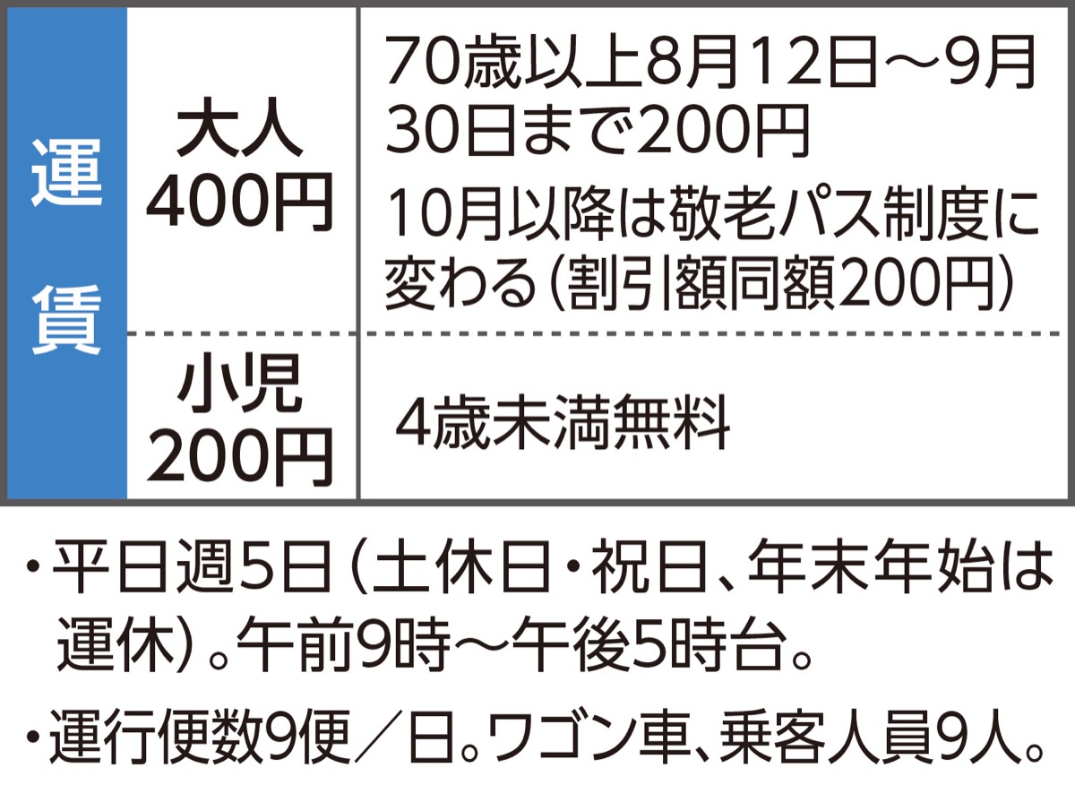 運行事業者の(株)ケイサンタクシー岩崎高広代表は「住民の期待に応えたい」と話し、森幹夫誘致委員会委員長は「収支率を上げて本格運行をめざす。空く時間帯を少なくし、乗客の平均化を図りたい」と語る。