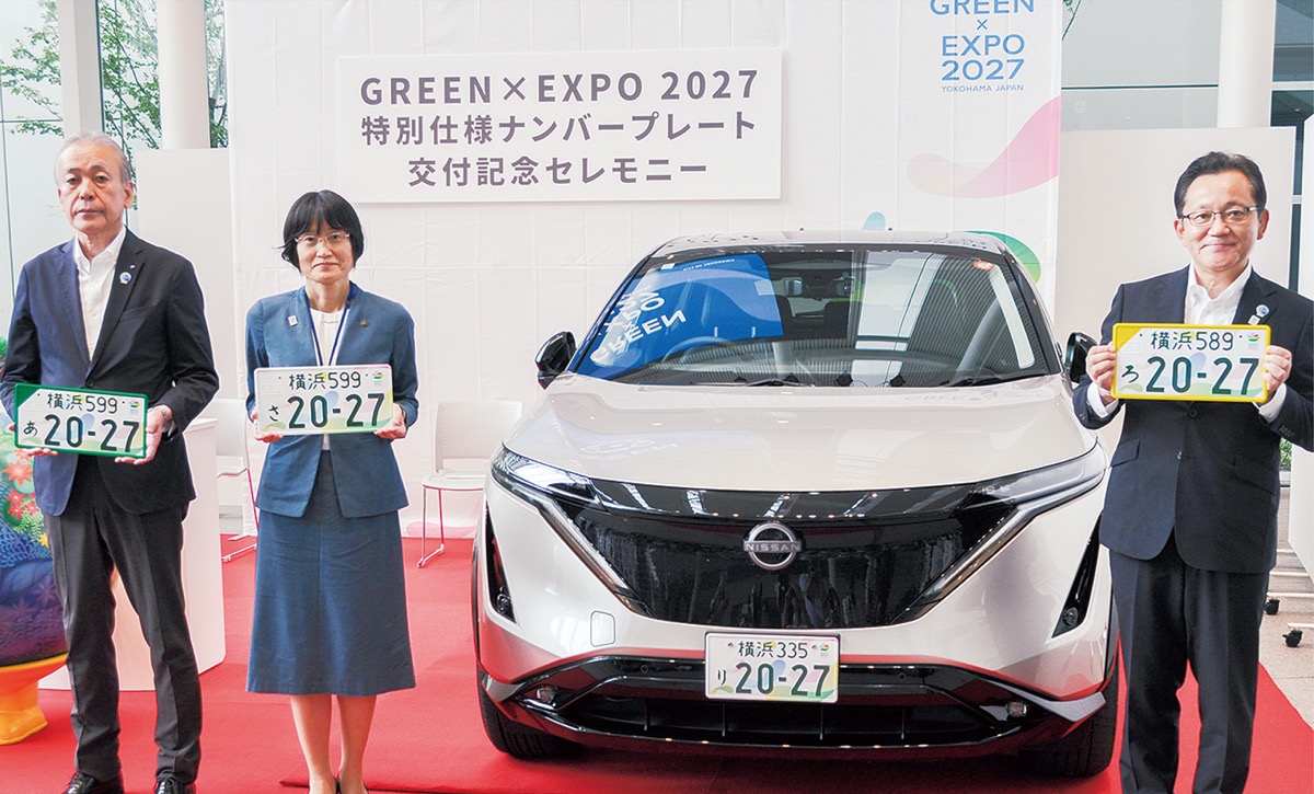 「GREEN×EXPO 2027」(国際園芸博覧会)特別仕様のナンバープレートの交付が、7月14日から始まった。同日には横浜市役所で記念セレモニーがあり、同プレートを取り付けた横浜市の公用車がお披露目された。