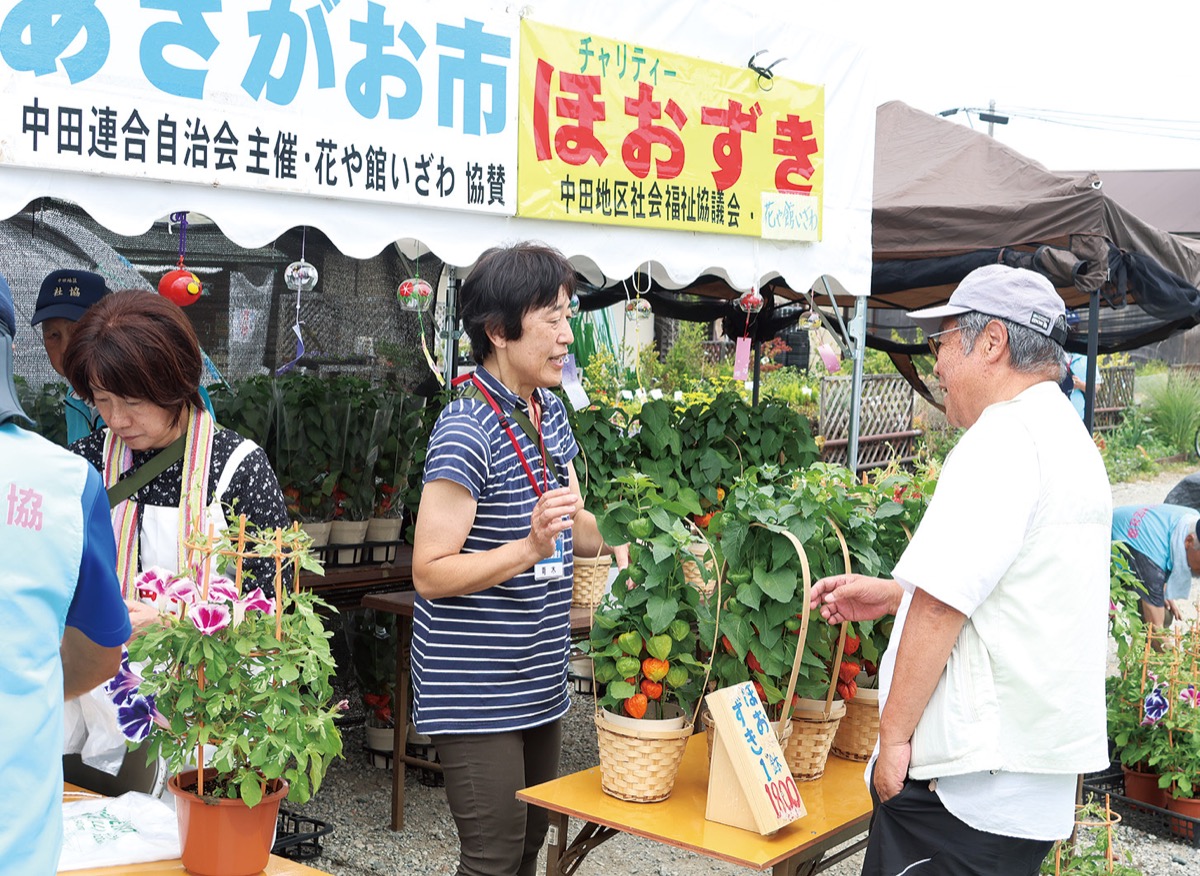 同日と翌13日には、泉区の立場駅近くでもチャリティーイベント「朝顔・ほおずき市」が開催された=写真。中田連合自治会と中田地区社会福祉協議会が主催。