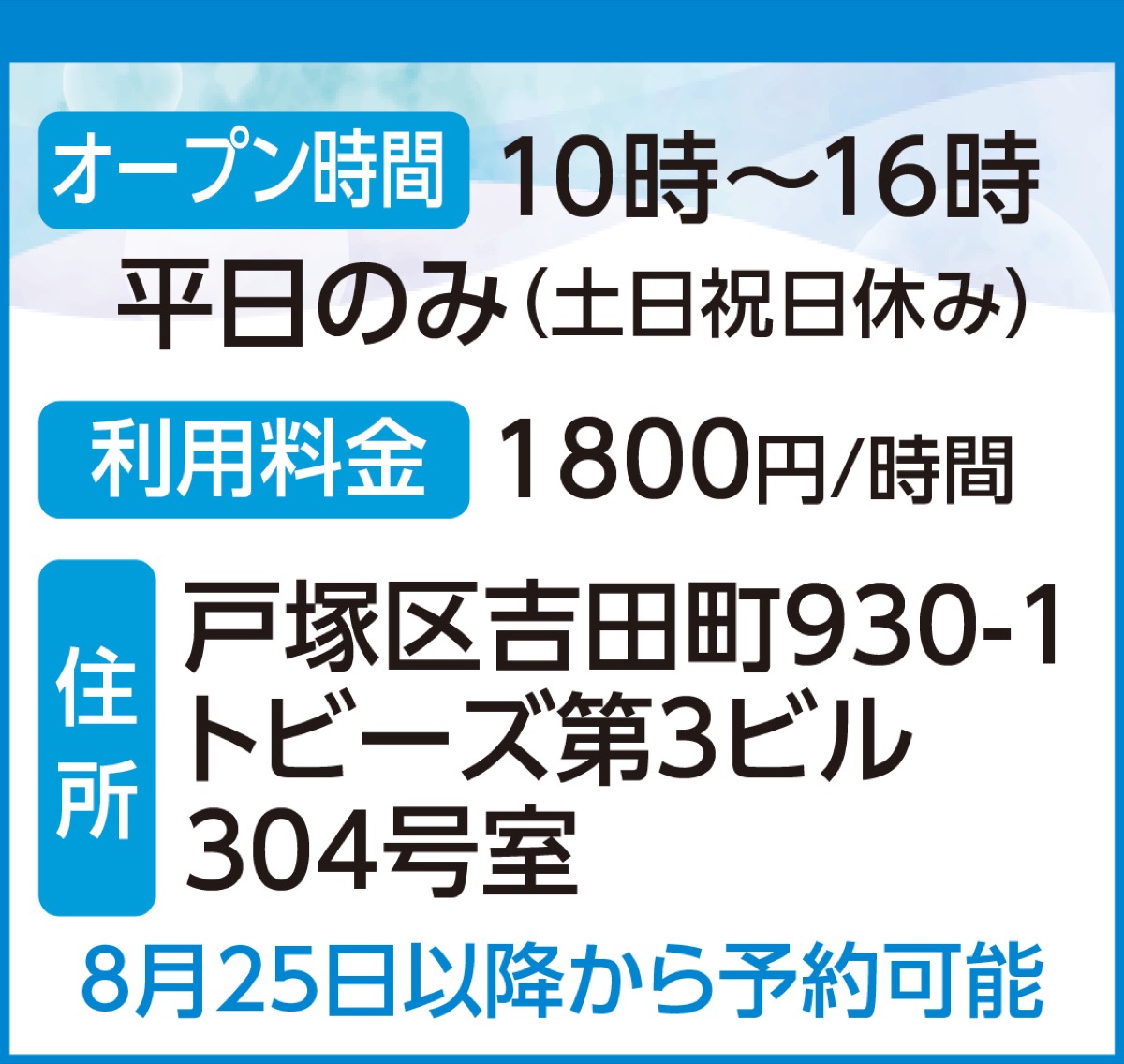 こうした声に応えるため、イオンスタイル戸塚の目の前にあるマンション内にレンタル会議室『トビーズ・ビズ』が誕生した。8月25日以降から予約できる。