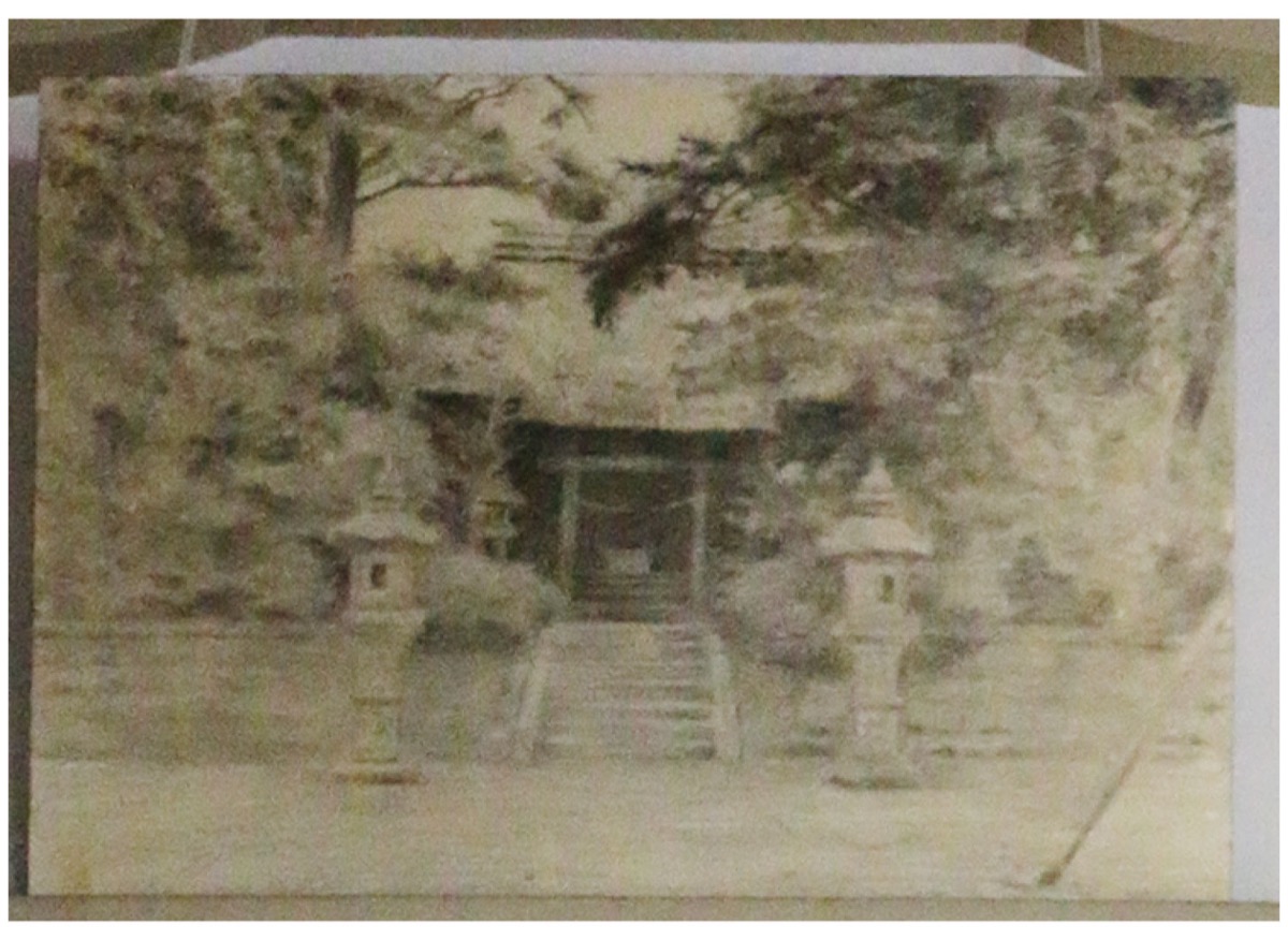 小雀町在住の画家・鶴巻謙郎さんがこのほど、小雀五霊神社の本殿に飾られる絵画を奉納した。同神社に保存されていたかつての神社本殿の写真を鉛筆画に描き起こしたもので、本殿参拝時に見ることができる。