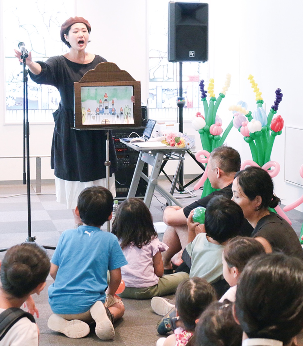 「紙芝居屋の声楽コンサート」では、ソプラノ歌手の松崎夏美さんが『北風小僧の寒太郎』などの耳馴染みのある楽曲を子どもたちと歌唱。紙芝居『子守歌』を手遊び歌を交えて披露した。