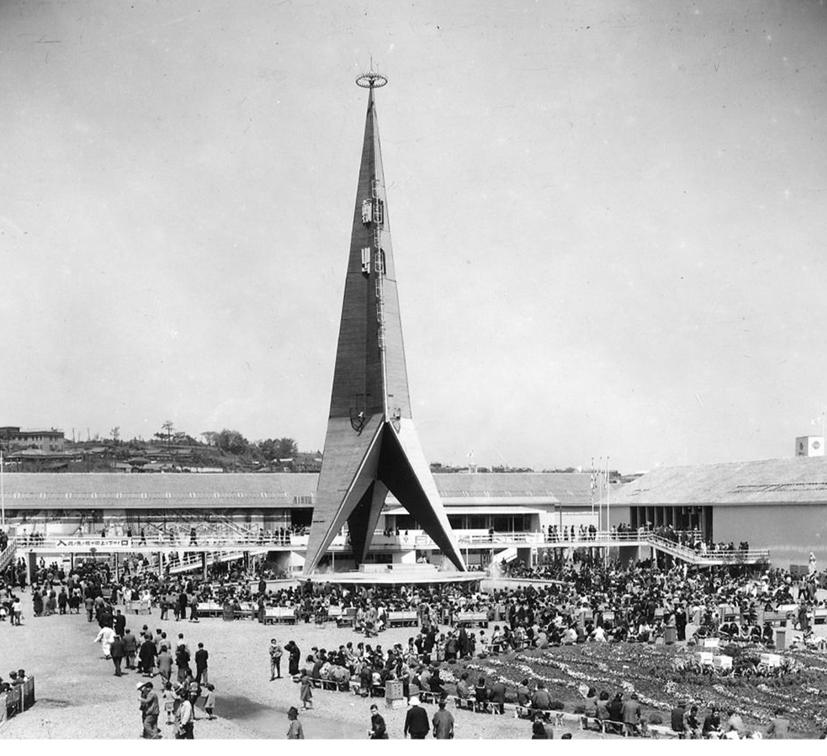 太陽の塔や大屋根リングなど、博覧会にはシンボル的存在が付き物だが、日貿博のシンボルとなったのがメイン会場だった反町会場の「三角塔」だ。高さ30mほどとみられ、貿易の3つの要素「輸入」「生産」「輸出」の文字が各面に記された。のちに横浜スタジアムや野毛の都橋商店街ビルを設計した市内出身の建築家・吉原慎一郎が手掛けた。