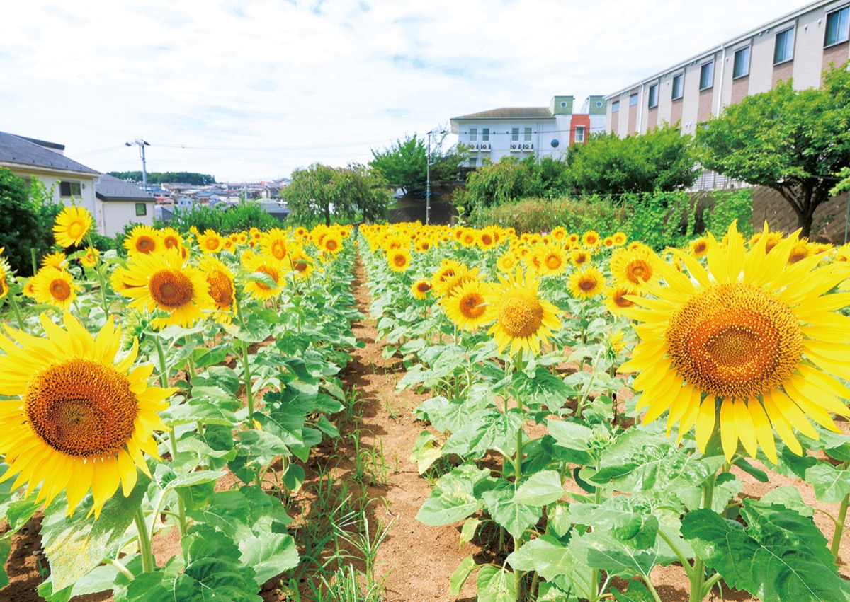 泉区岡津町の児童養護施設「杜の郷」が毎年育てているヒマワリ畑が満開を迎え、近隣住民らの目を楽しませている=8月16日撮影。