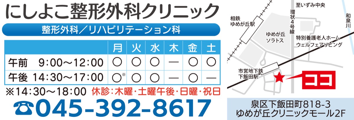市営地下鉄「下飯田駅」前・ゆめが丘クリニックモールの「にしよこ整形外科クリニック」。戸塚区汲沢町の本院・西横浜国際総合病院と連携し、通院から手術を含む治療、リハビリテーションまで一貫して行っている。