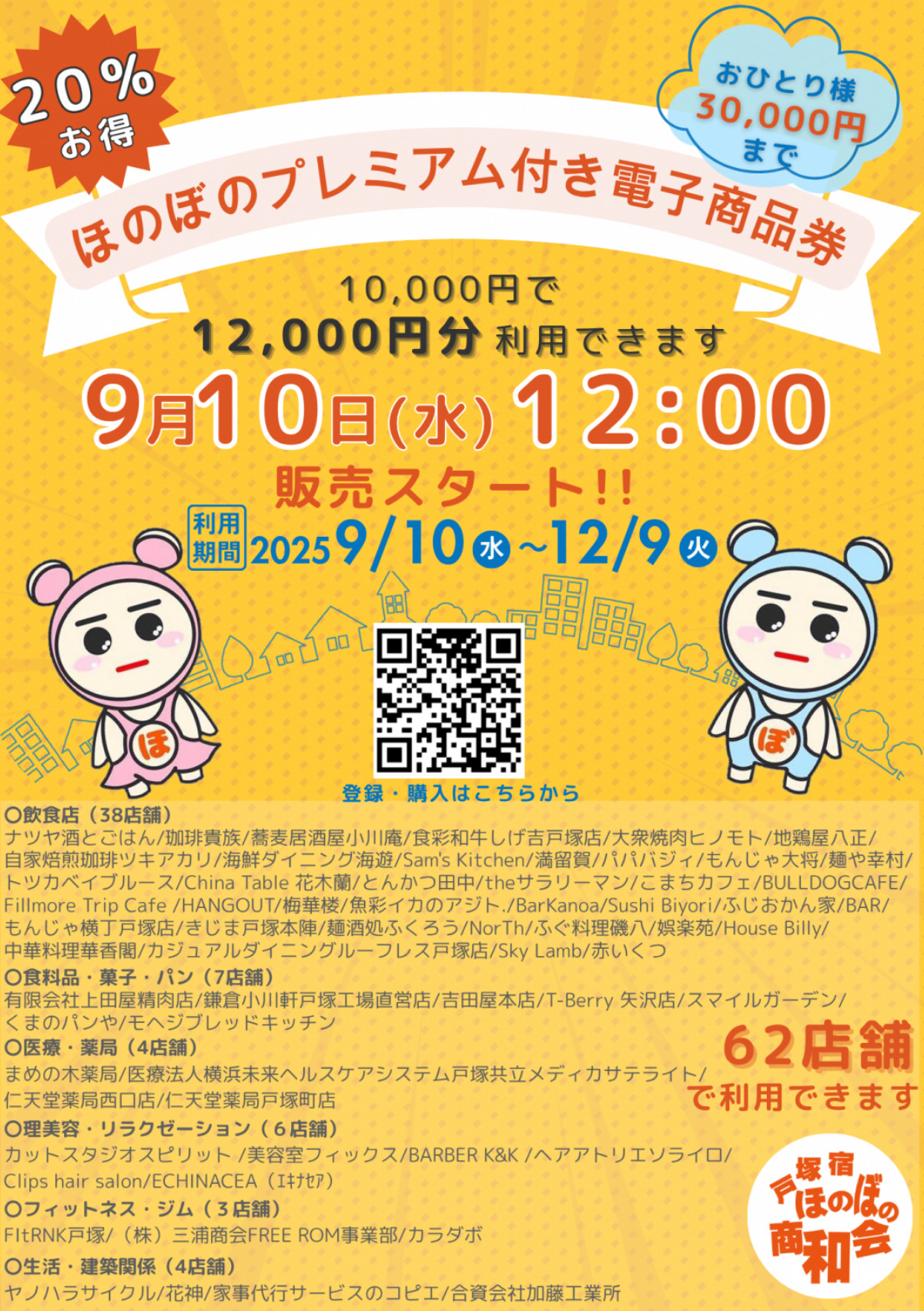 戸塚宿ほのぼの商和会主催の「プレミアム付き電子商品券」が9月10日(水)から販売される。