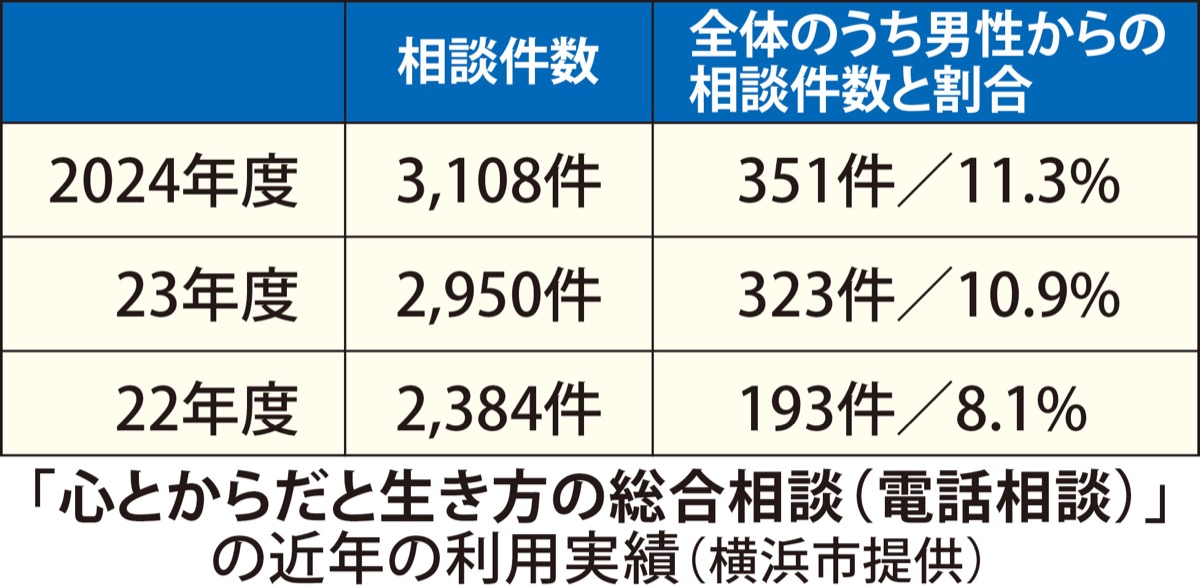 男性専用の相談窓口は毎月第1、第3水曜日の午後7時から9時まで開設。1回につき30分ほど、悩みや不安を専門の男性相談員が傾聴する。無料で、匿名も可能だ。相談は【電話】045・443・7311。