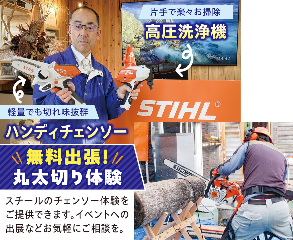 一方、同社では一般向けの商品も豊富に取り扱う。園芸を楽しむ人に人気の草刈り機やブロワー、日曜大工に便利なインパクトドライバーやハンディチェンソーなど、実物を間近で見て体験できる。