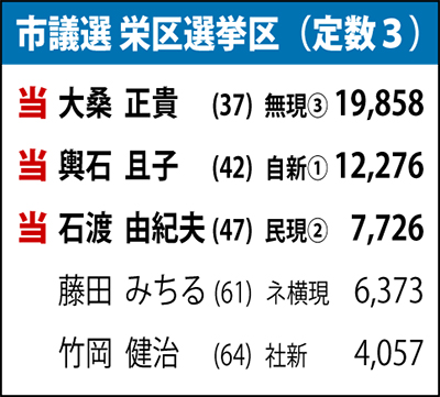 横浜市議選は、みんなの党からの応援を受けた無所属の現職・大桑正貴氏が2位と7582票の大差をつけて3期連続のトップ当選を果たした。「頂いた票の重みと3期目であることをしっかりとかみしめて、若いだけと言われないようにしたい」と大桑氏。2位には自民党の新人・輿石且子氏が入り、実姉の角田宏子氏が辞職した平成21年10月以来失っていた自民の議席を取り戻した。輿石氏は「名前を売るだけの選挙ではなく、政治活動として一人ひとりと約束を交わす選挙戦だった」と振り返った。最後の議席に滑り込んだのは、民主党の現職・石渡由紀夫氏。原発問題に揺れる東京電力出身という点でも注目され、「厳しい選挙戦だった。支持層の広がりはなかったが、支援組織が強固だった」と勝因を語った。
