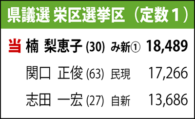 1223票差で敗れる波乱の展開。午後11時すぎに楠陣営に当確の一報が入ると楠氏は「皆様のおかげ」と涙ながらに支援者と握手を交わした。「震災による自粛ムードの影響を受けたが、新人として名前と政策を訴えなければならなかった。スタートダッシュで乗り切った」と選挙戦を振り返り、支援者を前に「しっかり仕事をして生まれ育った栄区に恩返しをしたい。神奈川の改革は私にお任せください」と力強く宣言した。