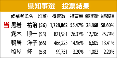 神奈川県知事選は栄区でも黒岩祐治氏が圧勝。露木順一氏や鴨居洋子氏の追随を許さなかった。