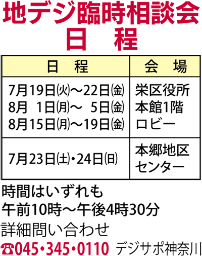 テレビの地上デジタル放送への完全移行に伴い、アナログ放送が7月24日(日)で終了する。栄区役所に開設されている総務省デジサポ神奈川の選任アドバイザーによる「地デジ臨時相談コーナー」には、相談に訪れる人が後を立たない。