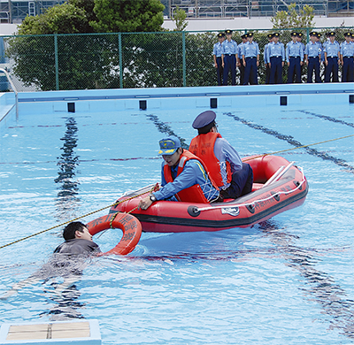 栄警察署は6月23日、警察学校内のプールで水難救助訓練を行った。