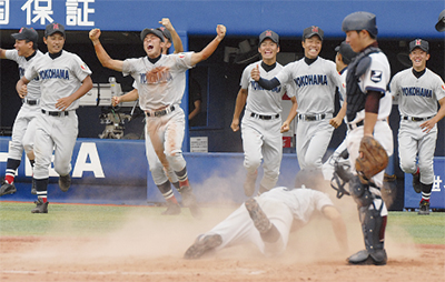 3年生となった今年は、主将としてチームを牽引。甲子園出場をかけ、桐光学園と戦った夏の神奈川大会決勝では、「最後に校歌を歌うのは俺たち。気持ちでは絶対に負けない」とチームメートに呼びかけ、延長10回の裏、近藤捕手の適時打で自らが本塁に飛び込み、サヨナラ勝ち。全国大会への切符をもぎ取った。