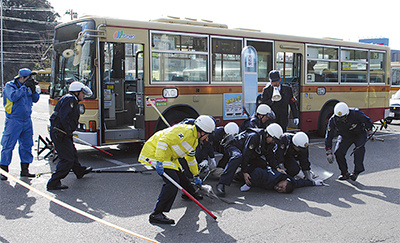 昨年は停車中のバスに外部から刃物を持った犯人が侵入する想定で同様の訓練を実施したが、今年は、大船駅前のバスロータリーで乗客が暴れ、刃物で客を切りつける状況を想定した。