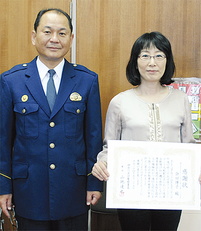 栄警察署(山地達也署長)は、振り込め詐欺の被害を未然に防いだとして、ファミリーマート大船駅北店(竹内香織店長)のパート店員・会田博子さん(50・笠間在住)に5月25日、感謝状を贈呈した。
