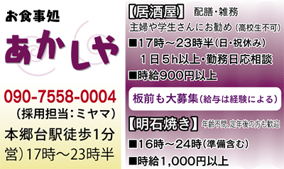 【居酒屋】▽配膳・雑務/17時〜23時30分(日・祝休、1日5時間以上、勤務日応相談)、時給900円以上、学生も歓迎(高校生不可)▽板前/17時〜23時30分(日・祝休み)、給与は経験による