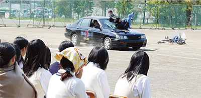 金井高校(林忠校長)は5月14日、3年生と鎌倉養護学校金井分教室の生徒を対象にした交通安全教室を同校校庭で実施した。