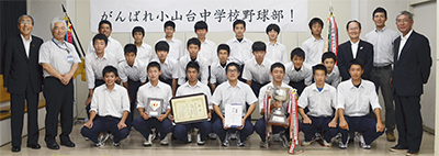 小山台中学校(佐藤實校長)野球部が横浜市中学校春季野球大会で初優勝、続く県大会でも優勝し、8月12日(月)から15日(木)に横浜スタジアムで行われる「第30回記念全日本少年軟式野球大会」への出場を決めた。栄区内の中学校が同大会に出場するのは初めて。6月12日には栄区役所で激励会も行われた。