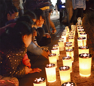 11回目の今回は、横浜を愛する市民団体・I Love Yokohamaや栄区役所、リリスのこどもアートキャラバン、本郷台小学校5年生、石井造園(株)なども参加。午後5時ごろ火が灯され、和紙や竹筒、ペットボトルなどを使って各団体が作ったキャンドルの光が会場を照らすと道行く人たちが足を止めていた。