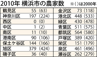 横浜市の農家数は4202戸(2010年調査)で県内最多。しかし、後継者不足などもあり、00年の4693戸に対し、491減となっている。市はこれまでも、小松菜・トマト・白菜・ナシなど、野菜26種と果実4種の計30品目を「横浜ブランド農産物」に認定。販売する際に付けるロゴマーク「はま菜ちゃん」を作るなど、市内農産物の付加価値を高める後押しをしてきた。しかし「ブランド化に至るには、まだPRが足りていないのが現状」と市環境創造局担当者は話す。