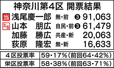 第47回衆議院総選挙の投開票が12月14日に行われた。4人によって争われた神奈川4区(栄区・鎌倉市・逗子市・葉山町)では、無所属の浅尾慶一郎氏(50)が9万1千余票を獲得し、小選挙区を制した。自民党・山本朋広氏(39)も比例区での復活当選を果たした。共産党・加藤勝広氏(70)、無所属・荻原隆宏氏(44)は支持を広げることができなかった。