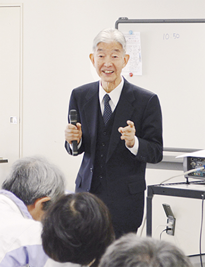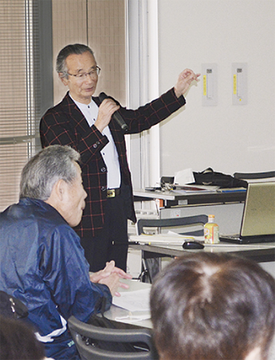 講師は、ともに区内在住で多くのマラソン大会に出場してきた松本寿吉郎さん(80)=写真右=と橋本正道さん(77)=同左。約50人の参加者に対して、それぞれの経験から走ることの楽しみや苦労などについて語った。