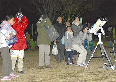 最後には同天文台のスタッフによる解説を聞きながら、月や金星などを観測。参加者は同天文台が準備した望遠鏡や双眼鏡と自分たちで作った望遠鏡を使って夜空を見上げ、「すごい」「明るい」と驚きの声を上げていた。
