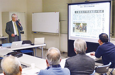 これは異業種交流会「さかえ横浜会議」が主催して行われた講演会で、NPO法人救助犬訓練士協会事務局顧問の山田道雄氏が講師を務めた。当日は消防関係者をはじめ、約30人が参加。山田氏は東日本大震災や昨年の広島市で起きた土砂災害でも活躍した災害救助犬について、これまでの活動や震災から4年が経った現状、今後の課題などを説明した=写真。