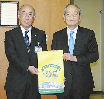 3月11日には関係者らが県教育委員会(横浜市中区)を訪問し、寄贈式が行われた。式では、筒井会長から桐谷次郎教育長にカバーを贈呈。筒井会長は「新入学児童の交通事故防止のため、有効に活用してほしい」と話した。