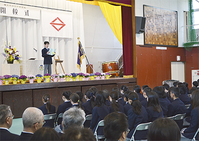生徒代表の言葉では、生徒会長の豊田晴道君(2年)が登壇。文化祭や体育祭、自然教室など同校で過ごした2年間の思い出を振り返り、「庄戸中のプライドと良い所の2つを大切にして、上郷中学校と合併しても庄戸中の明るさと仲の良さを周りの人に伝えていきましょう」と話した。