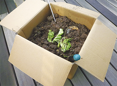 「ダンボールコンポスト」とは、段ボール箱に土壌改良材などの基材を入れて作る生ごみ処理容器。微生物の力を用いて生ごみを分解し、堆肥化するもので、家庭のベランダなどでも手軽に取り組むことができる。