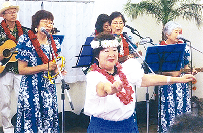 笠間町内会の町内会館「かさまゆうわ館」で7月5日、ハワイアンバンドの演奏とフラダンスのパフォーマンスが行われた。