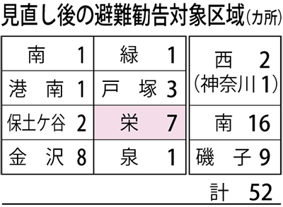 横浜市はこのほど、土砂災害警戒情報をもとに避難勧告を発令する市内対象区域の見直しを実施。地質専門家の調査などを踏まえ、これまでの133カ所から52カ所に絞り込んだ。栄区は7カ所31世帯が対象となり、区では今後、対象世帯へ周知を行う予定だ。