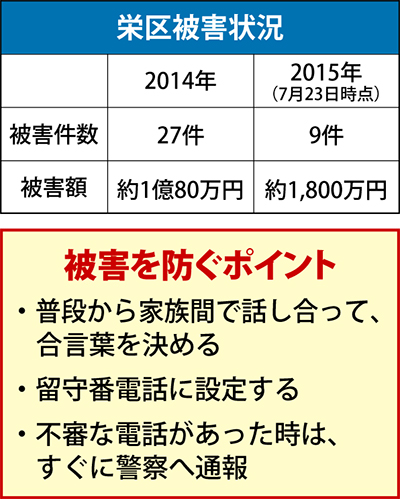 栄警察署(小森安晃署長)管内で発生した振り込め詐欺の被害は、7月23日時点で9件、約1800万円だと分かった。前年の同時期と比べて件数、被害額ともに大きく減少しているが、手口が多様化していることなどから、同署は依然として注意を呼びかける。