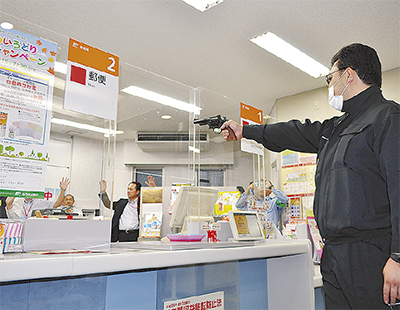 訓練で窓口対応した女性職員は「『手を上げろ』と言われ何もできなかった。身長の目視に差が出た。思っているより高いとわかった」と話した。渡邉局長は「(模擬強盗訓練は)他人事ではない。狙われているという気持ちで臨み、ケガ人が出ないようにしたい」とあいさつした。