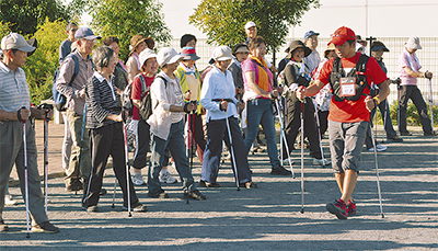 当日は日本ポールウォーキング協会の杉浦伸郎代表理事が講師を務め、初心者から経験者まで約50人が参加した。まずはポールを使った体操で身体をほぐしてから矢沢なかよし公園へ出発し、公園では歩く時のポイントなどを確認=写真。その後、余裕のある参加者は桂山公園まで歩いた。杉浦代表理事は「せっかくの健康づくりがけがのもとになってしまったら本末転倒。最初と最後では皆さんの姿勢も変わっていたので、正しい身体の動かし方で続けてもらえたら」と話した。