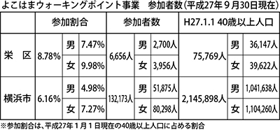 昨年から横浜市が進めている「よこはまウォーキングポイント」事業。開始から1年が経ち、参加者数は15万3000人(12月4日現在)を超えた。栄区の参加割合(40歳以上人口に占める割合)は8・78%(9月30日現在)で、市内第1位となっている。