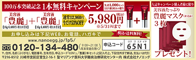 聖マリアンナ医大のベンチャー企業(株)ナノエッグの皮膚科学研究から生まれた口もと年齢美容液『豊麗(ほうれい)』。2010年12月の発売から累計100万本突破とその勢いはとまらない。『豊麗』には、肌に浸透(※2)しやすくするため、独自の技術でハリ成分(α-リポ酸)をナノカプセル化した「リポアクティブVE(整肌成分)」を配合。カプセルが長く肌にとどまり、成分をゆっくり放出する。ダブルのハリ成分(コエンザイムQ10)配合による相乗効果で弾力ある輝くようなハリ・ツヤ肌へ導く。