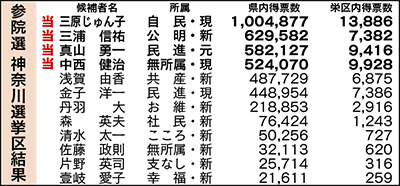 参議院議員選挙の投開票が7月10日に行われた。4議席を12人が争った神奈川選挙区では、自民党の現職・三原じゅん子氏(51)が約100万票を獲得し、トップ当選。以下、公明党の新人・三浦信祐氏(41)、民進党の元職・真山勇一氏(72)、無所属の現職・中西健治氏(52)が当選した。自民党は選挙後に中西氏を追加公認し、与党が3議席を獲得した。