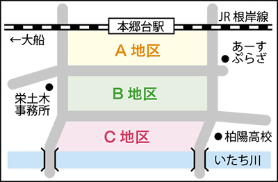 同地区計画区域の面積は約7・3ヘクタール。A地区には現在、駅前広場や駅前公園・バスロータリー・商店街などがあり、B地区はUR団地4棟やスーパー、郵便局などで形成。約2・2ヘクタールのC地区内には2015年9月までに全378戸の退去が完了している国家公務員住宅6棟がそのまま残されている。