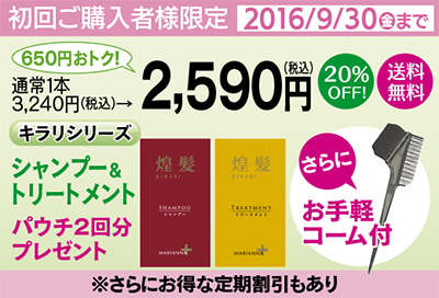 通常価格は税込3240円。今なら初回限定で20%オフの2590円(送料無料)とお得。さらにシャンプー・トリートメントのパウチ2回分とお手軽コームをプレゼント(9月30日迄)。