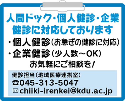 同院では人間ドック、個人健診、企業健診にも対応。詳細・問い合わせは右下記載の健診担当へ。