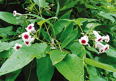 なんとも可哀想なネーミングですね。しかし万葉集の時代から「ヘクソカズラ」で詠まれていました。花は小さな白い筒状で、筒の中は鮮やかな紅色をした美しく可愛らしい花なのに…。「可愛〜い!」といって鼻を近づけたとたん、「うーん臭い!」。まるでおならを嗅いだような悪臭を放つため、この名がつけられました。古くは「屁臭(へく)さ」で表し、訛(なま)って「屁糞(へく)そ」になったと言います。「かずら」は蔓(つる)のことで、この臭いは花以外の葉、蔓、実にもつきまとっています。このような悪臭を持つのは、虫たちに食べられないための自衛手段で、長い年月をかけて獲得してきたものです。わざわざ香水で男性を魅了させる女性とは逆に、悪い虫を追い払う働きがあります。