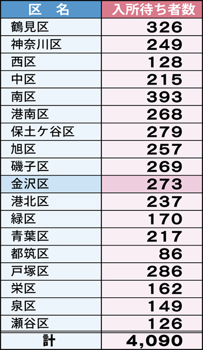 11年4月1日現在の入所待ち数(在宅)は、横浜市全体で4090人。区別では、南区の393人が最大で、鶴見区がこれに続く。反対に入所待ちが少ないのは、高齢化率の低い都筑区(86人)など。金沢区は5番目に多い273人だった。入所までに平均14ヵ月を要しており、市は、中期4か年計画で、13年までに12ヵ月にする目標値を定めている。