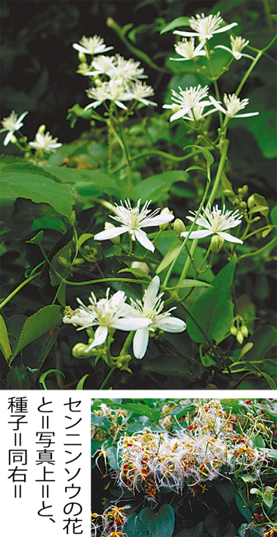 またセンニンソウは、つる植物で他のものに巻きつき、自分の体を固定させています。フジやアサガオのようなつる植物は、一般に茎の部分が他のものに巻きついて固定しますが、センニンソウは5枚の葉(羽状複葉)の柄(葉柄)が巻きつくので、珍しい巻きつき方になります。その他にもエンドウやゴーヤのように茎や葉の変形した巻きひげ、ツタのように根の変形した吸盤等いろいろな巻きつき方があります。センニンソウは有毒のためか、別名は「ウシクワズ ウマノハコボレ」。