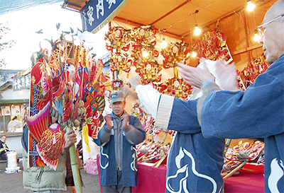 年の瀬も迫った12月9日、瀬戸神社で恒例の「酉の市」が開かれた。境内にはおかめや招福の縁起物を飾った熊手や達磨の市が並び、威勢のいい掛け声と手拍子が響いた。