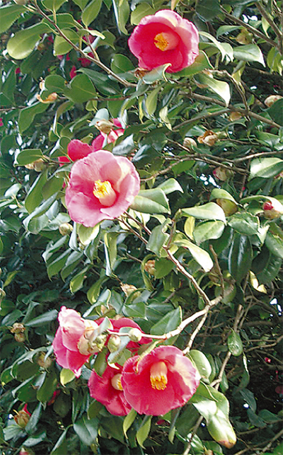 花の少ない冬に咲く大輪の花といえば「ツバキ」ですね。17世紀頃、この美しい花を見た西欧人は大変気に入り、その後ヨーロッパへ移入され、当時ヨーロッパ中で大人気になったといいます。南ヨーロッパを除くヨーロッパ大陸の常緑樹は、針葉樹が主でしたので、ツバキのように冬になっても葉が広く光沢があり、しかも大きな美しい花をさかせる植物は、大きな魅力だったのでしょう。歌劇「椿姫」もこうしたところから大ヒットしたのかもしれません。