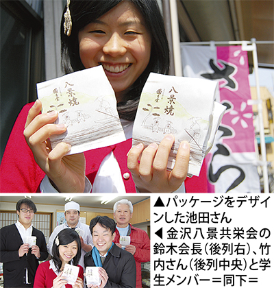 同店の和風マドレーヌ「八景焼」に描かれたのは、野島をバックに、海を眺めながら旅人が休んでいる風景。パッケージの絵と文字をデザインした池田麻美さん(2年)は、「歌川広重の『金沢八景』を見て、イメージを膨らませた。”八景らしさ”がどうやったら出るのか、悩みながら作りました」と話す。同店の店主・竹内晃一さんも「裏まで繋がって一つの絵になっているデザインは、包材業者がやらない学生ならではのアイデア。皆さんの協力で満足できるものができた」と学生たちの労をねぎらった。学生と商店街の協働の一例とし、次の展開につなげていきたい考えだ。