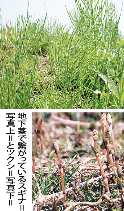 戦争末期、広島に原爆が投下された焼け野原に、真っ先に緑を取り戻したのはスギナでした。地下茎が熱線から免れたのです。地下茎は地の底まで伸び、閻魔(えん ま)大王の囲炉裏(い ろ り)の自在鉤(かぎ)になったと言われるくらい、深く伸びています。雑草とはいえ、地獄で閻魔様に会見した植物の強みと言えます。